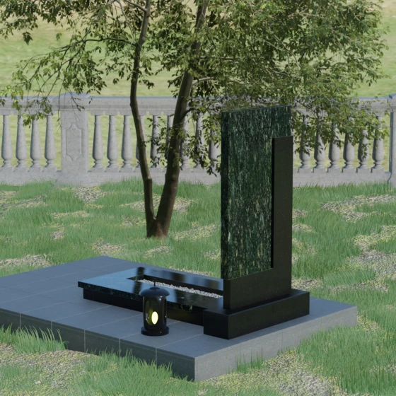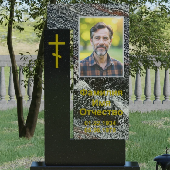 Данная модель выделяется своей сложной, архитектурно выверенной асимметрией. Основная вертикальная стела, выполненная из глубокого черного камня, дополнена массивным Г-образным элементом, который словно обнимает центральную часть, создавая защитный контур. Геометрия изделия строгая и лаконичная: прямые углы и четкие фаски подчеркивают монументальность конструкции. Особое внимание уделено игре фактур: идеально гладкая, зеркальная полировка лицевых граней контрастирует с архитектурной сложностью сочленения двух блоков.