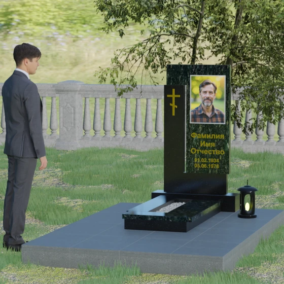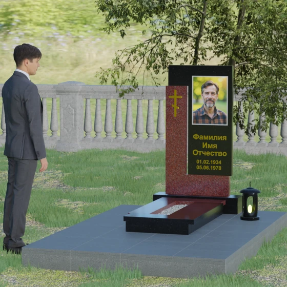 На боковом пилоне расположен каноничный православный крест. Его исполнение отличается благородной простотой — это лаконичный трехсоставный символ веры, который не перегружает композицию, но расставляет необходимые духовные акценты. Благоустройство участка продумано до мелочей: стела установлена на широкий полированный цоколь, а место захоронения полностью закрыто сплошной надгробной плитой. Такое решение не только придает ансамблю вид законченного монолита, но и обеспечивает практичность, избавляя от необходимости сложного ухода за почвой.