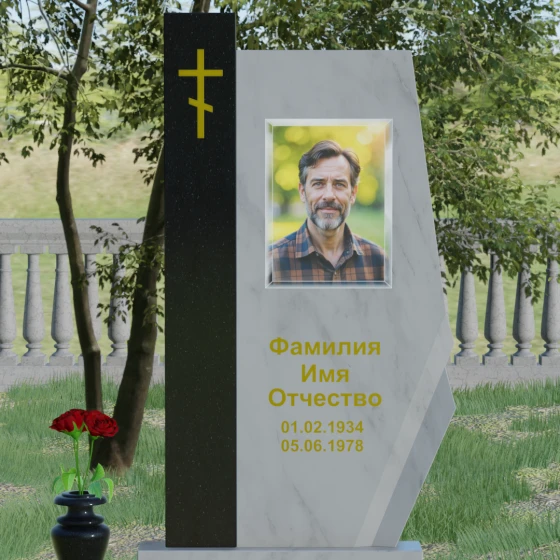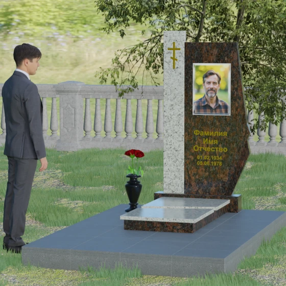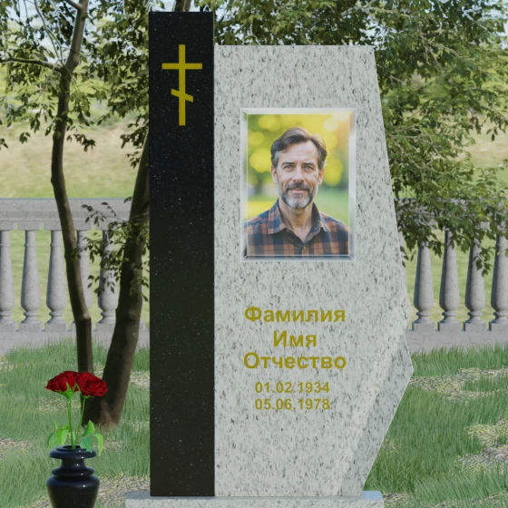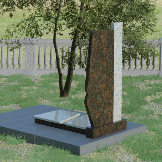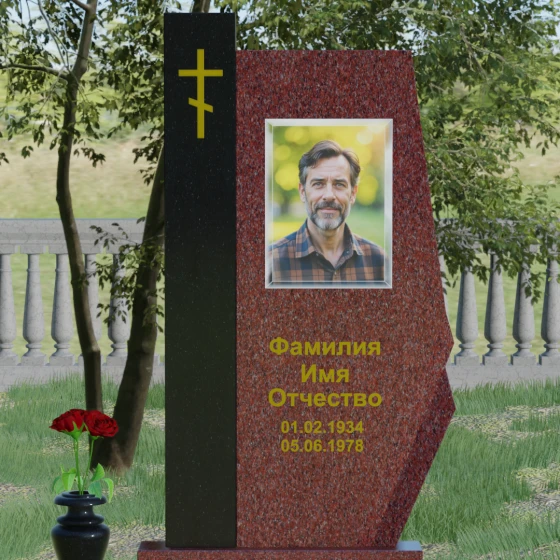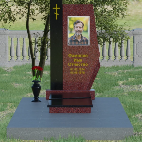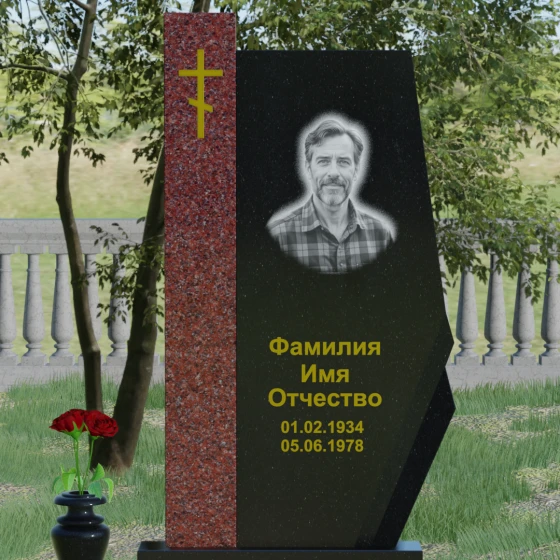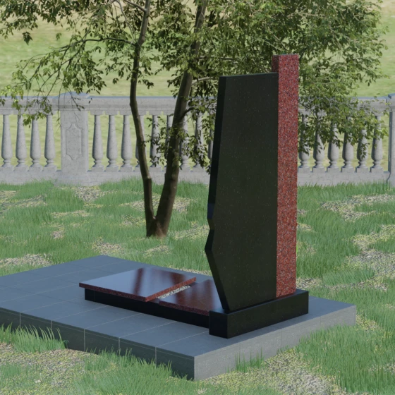 Данная мемориальная композиция — это торжество современной архитектурной мысли, воплощенное в благородном граните. Выбор этой модели обусловлен её уникальной асимметричной геометрией, которая выделяет захоронение на фоне типовых решений. Комбинированное исполнение из двух контрастных видов камня позволяет создать глубокий визуальный акцент: вертикальная колонна из насыщенного красного гранита символизирует духовную опору и жизненную энергию, в то время как основная стела из глубокого черного камня олицетворяет вечный покой и скорбь. Надгробие из натурального камня такой формы выглядит монументально и одновременно изящно благодаря сложной огранке. Правая грань основной стелы дополнена характерным скосом и ступенчатым вырезом, что придает изделию динамику и многогранность. Особое внимание уделено игре света и тени на полированных поверхностях: зеркальный блеск черного гранита отражает небо, создавая эффект глубины, а матовые фаски подчеркивают строгость и чистоту линий архитектурного ансамбля.