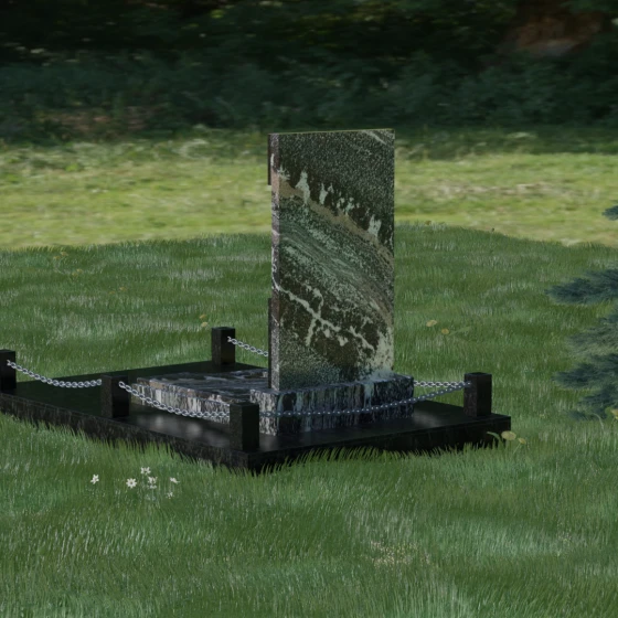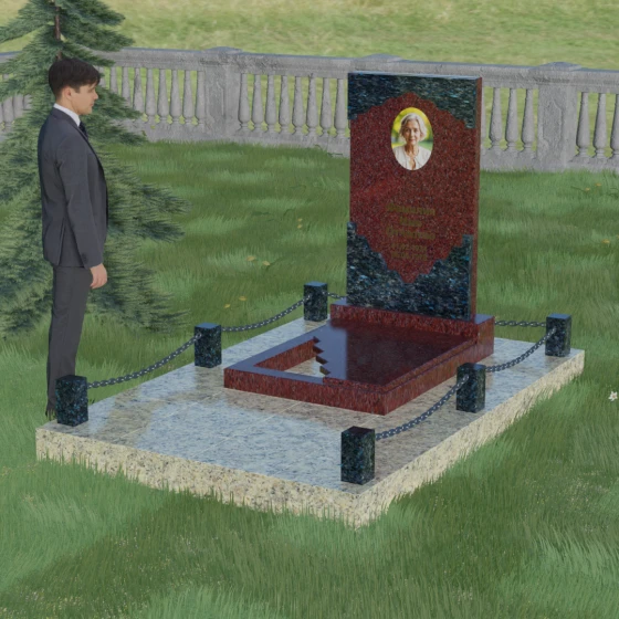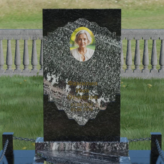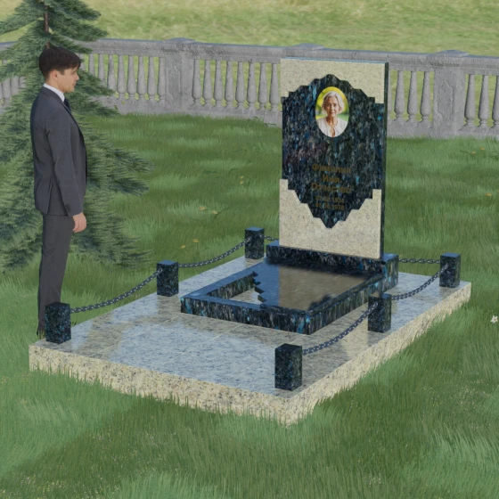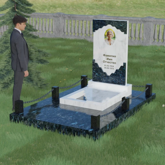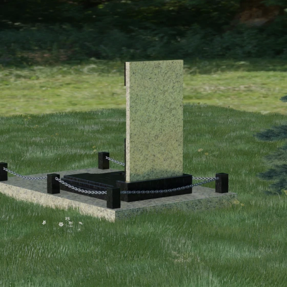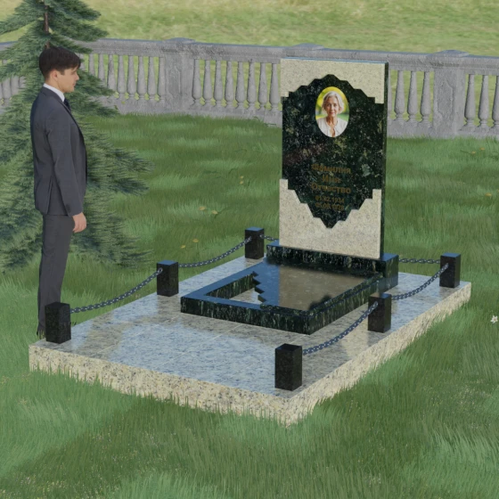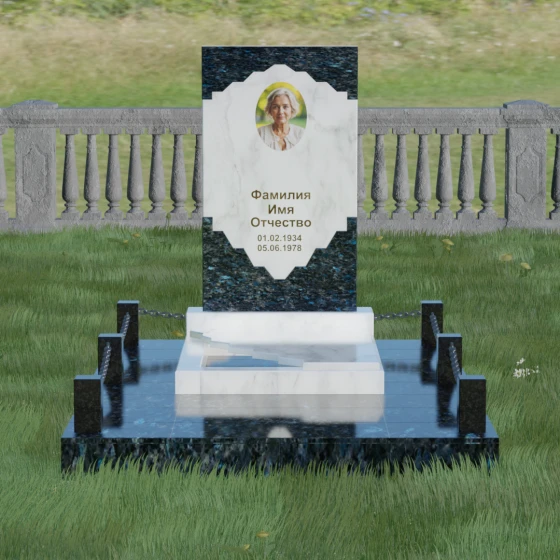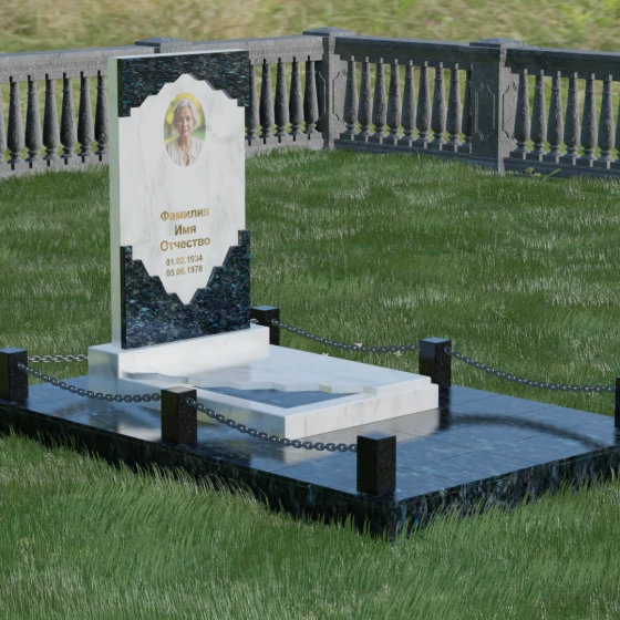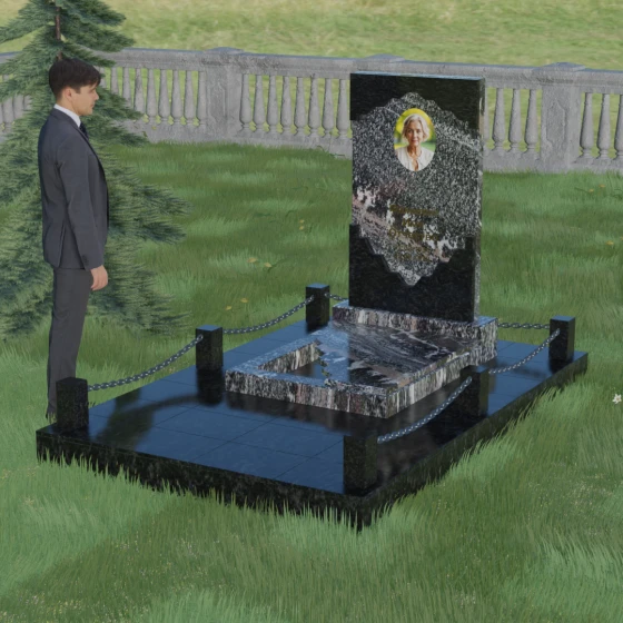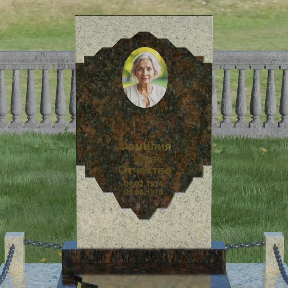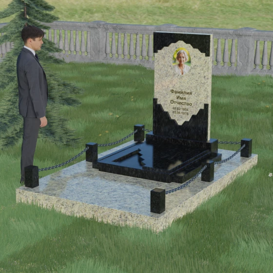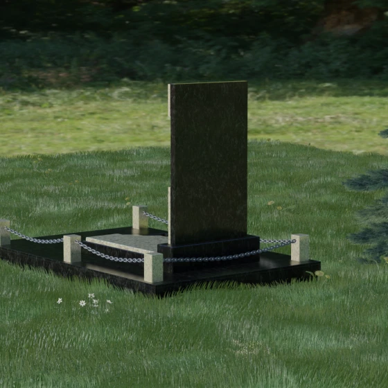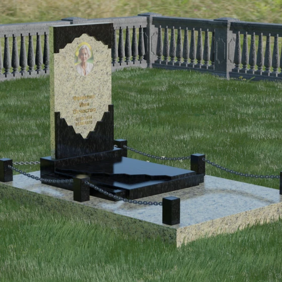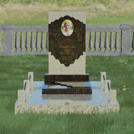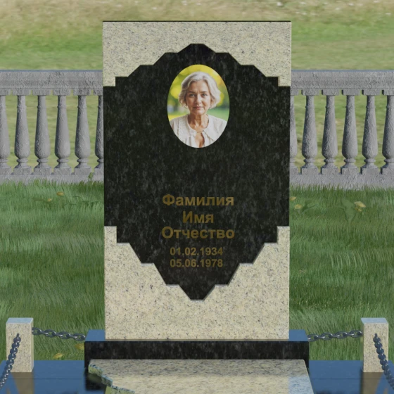 В этой модели особое внимание уделено игре фактур и визуальному объему. Зеркальная полировка темного гранита обладает глубоким, почти космическим блеском, в котором отражается мир, подчеркивая монументальность и вечность камня. В противовес ей, светлая центральная часть имеет более мягкий визуальный тон, что позволяет акцентировать внимание на портрете и эпитафии. Ритуальное изделие дополнено комплексным благоустройством участка: основание облицовано гранитной плиткой, что не только создает эстетическую завершенность, но и гарантирует чистоту и легкость в уходе. Массивный гранитный цоколь по периметру укрепляет конструкцию, а декоративные столбики с металлическими цепями очерчивают границы сакрального пространства, создавая атмосферу уединения и покоя.