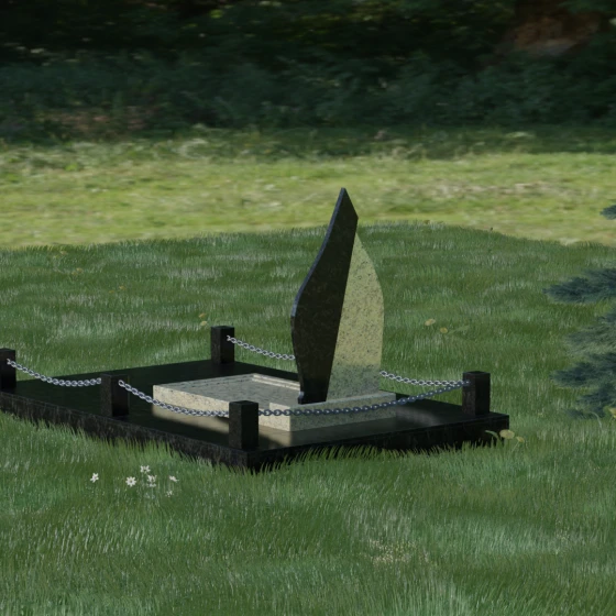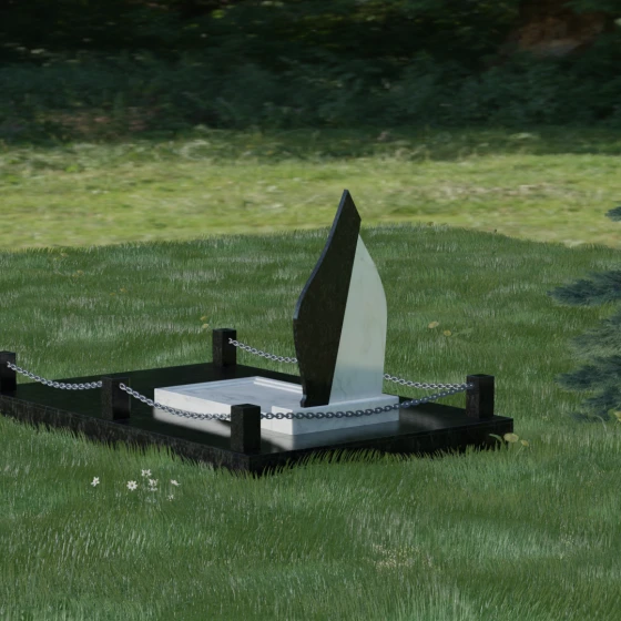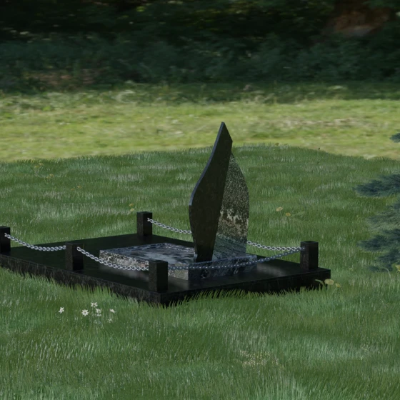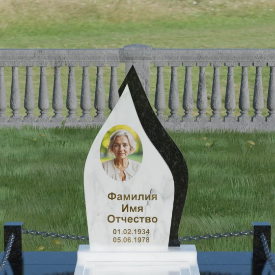 Центральным элементом ансамбля является вертикальная стела, чья форма напоминает застывшее пламя свечи или небесную слезу. Дизайн построен на изысканном контрасте двух видов камня, что придает монументу объем и динамику. Основная часть выполнена из глубокого темного гранита с идеальной зеркальной полировкой, в которой отражается небо, создавая ощущение чистоты и бесконечности. Правая грань стелы дополнена изящным «крылом» из более светлого, фактурного камня. Этот плавный изгиб символизирует жизненный путь, который никогда не бывает прямолинейным, и одновременно дарует чувство легкости и покоя.