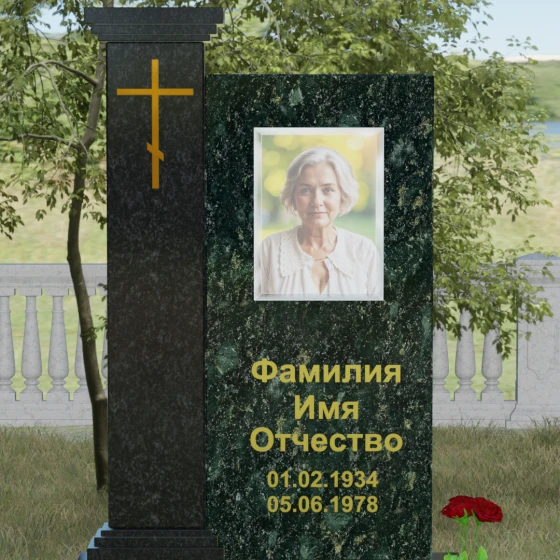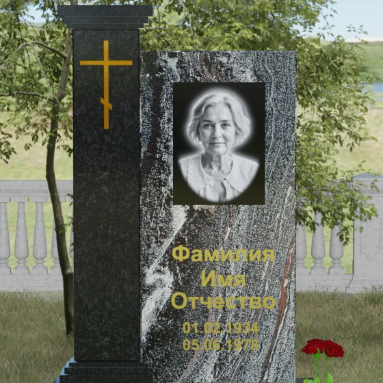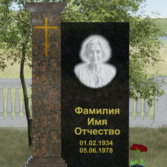 Композиция данного надгробия построена на гармоничном сочетании двух вертикальных элементов, установленных на массивное ступенчатое основание. Левая часть выполнена в виде величественной колонны с декоративным навершием в классическом стиле. На фронтальной стороне колонны расположена гравировка православного креста, покрытая сусальным золотом или имитирующим его составом, что придает мемориалу торжественный и одухотворенный вид. Правая часть — это лаконичная прямоугольная стела, предназначенная для размещения портрета и памятных надписей. Строгая геометрия линий подчеркивает внутреннюю силу и достоинство того, чья память здесь увековечена.