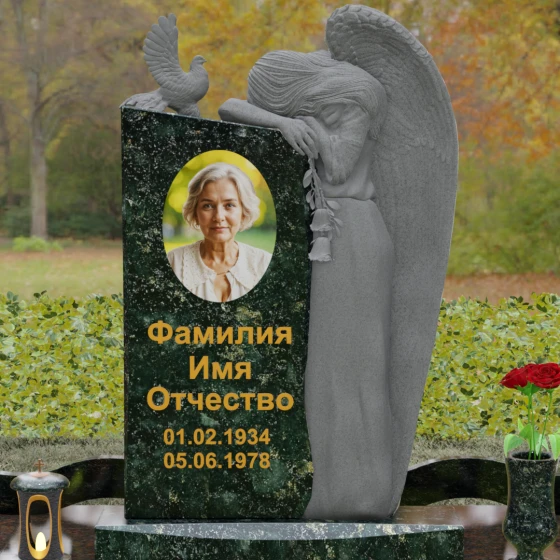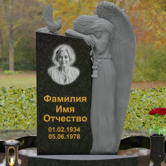Верхний контур монумента украшен реалистичной фигуркой голубя, символизирующего чистоту души и мир. Композиция выстроена на игре фактур: идеально гладкий, иссиня-черный гранит отражает окружающий мир, в то время как резные элементы имеют благородную шероховатость, подчеркивающую природную суть материала. Форма стелы асимметрична, что придает всему комплексу динамику и современный вид в стиле модерн, сохраняя при этом торжественную монументальность.
