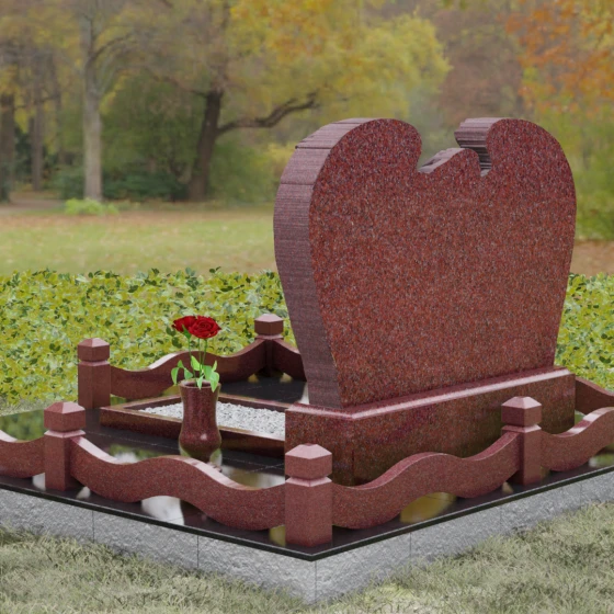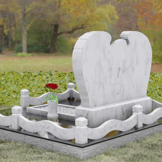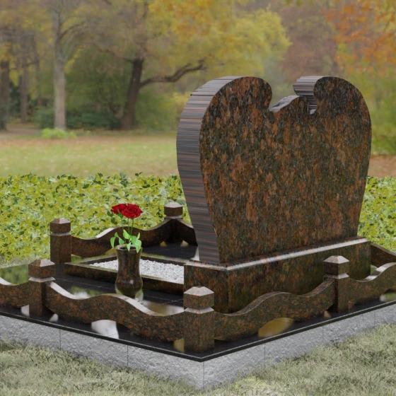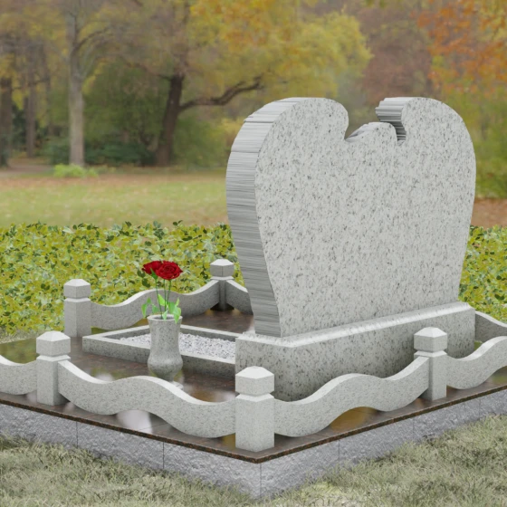 Геометрия комплекса продумана до мельчайших деталей, обеспечивая идеальный баланс форм. Горизонтальная ориентация стелы придает конструкции устойчивость и торжественность. Особое внимание уделено благоустройству прилегающего участка. Обелиск установлен на массивный гранитный цоколь, который не только приподнимает композицию над уровнем земли, но и защищает её от воздействия влаги. По периметру участок обрамлен изящным каменным ограждением: строгие столбики с пирамидальным завершением соединены плавными, волнообразными перемычками, повторяющими изгибы самой стелы. Вместо открытого грунта используется сплошная полированная плита с небольшим декоративным вырезом под цветник, заполненным белоснежной мраморной крошкой. Такое решение гарантирует эстетичный вид участка на десятилетия, полностью избавляя от необходимости борьбы с сорняками.