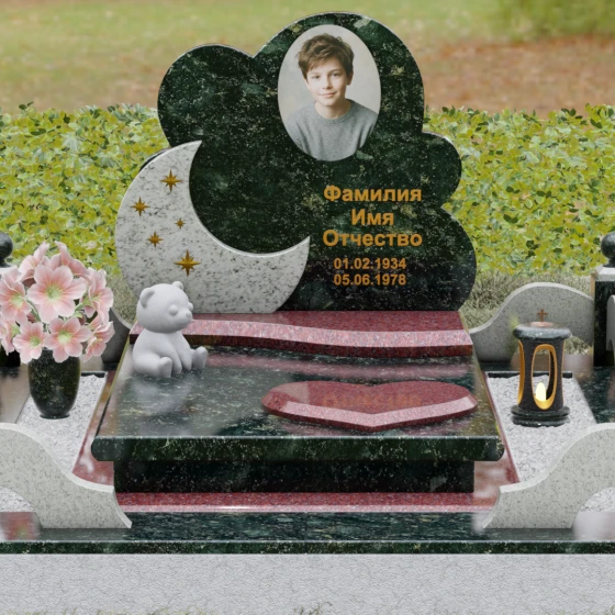 Данная мемориальная композиция — это воплощение нежности, глубокой любви и тихой грусти, застывшей в благородном камне. Выбор такой формы продиктован желанием выразить самые светлые чувства к ушедшему близкому человеку. Силуэт стелы, выполненный в виде мягкого, кучевого облака с плавными, округлыми очертаниями, символизирует покой и вечную жизнь души в небесных сферах. Асимметричная геометрия придает монументу индивидуальность, выделяя его среди строгих прямоугольных форм, и создает ощущение легкости, несмотря на внушительный вес натурального гранита. Особый акцент сделан на игре фактур и цветов: основная часть монумента из темного камня гармонично сочетается со вставкой из светлого гранита в форме изящного полумесяца. На этом светлом фоне выгравированы лаконичные золотые звезды, которые словно освещают путь памяти через десятилетия.
