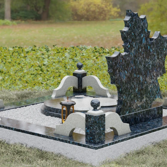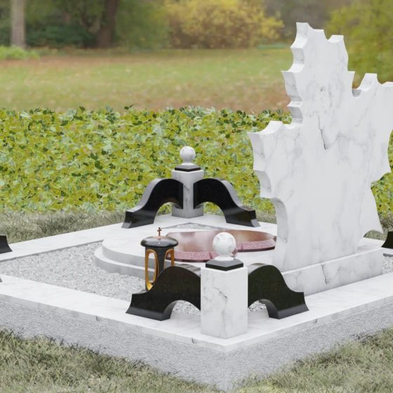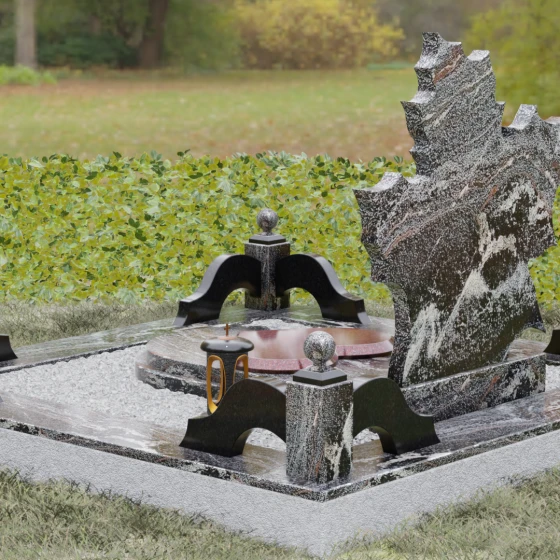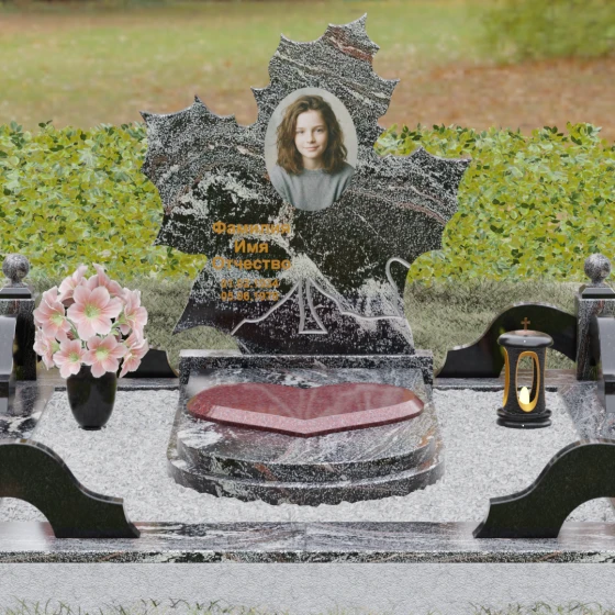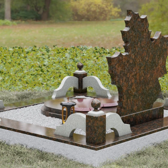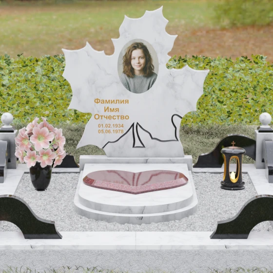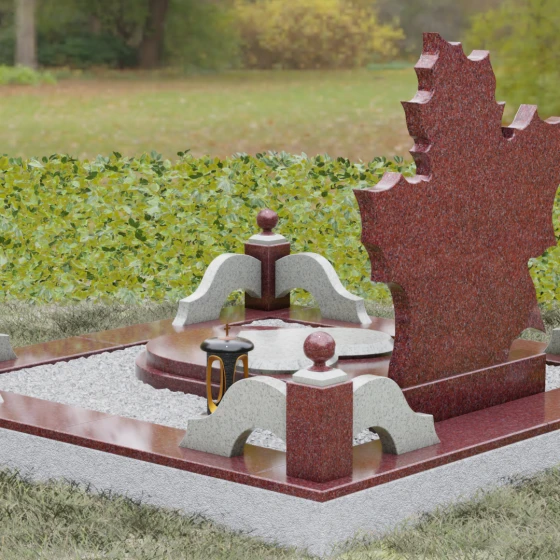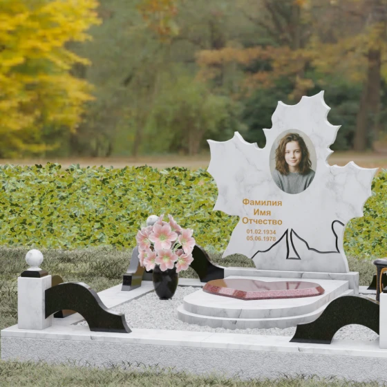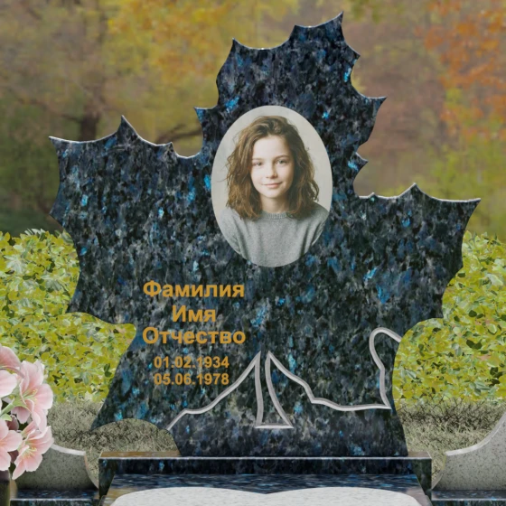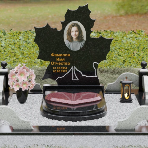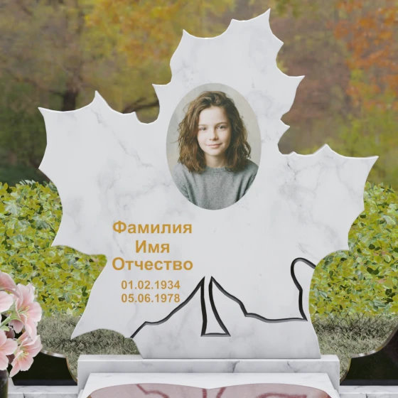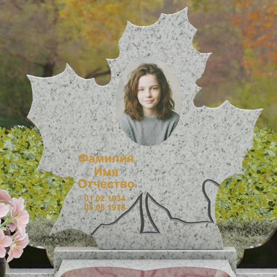 Данная мемориальная композиция — это воплощение глубокого уважения и вечной памяти, облаченное в художественную форму. Выбор формы кленового листа не случаен: в мировой символике он олицетворяет силу духа, красоту жизненного пути и мудрость. Каждая линия этой стелы пропитана эстетикой природного изящества. Резные края листа выполнены с филигранной точностью, создавая сложный, многогранный силуэт, который выделяется на фоне классических строгих форм. Плавные изгибы и отсутствие агрессивных углов призваны дарить чувство покоя и умиротворения, подчеркивая, что душа близкого человека обрела вечный приют в гармонии.