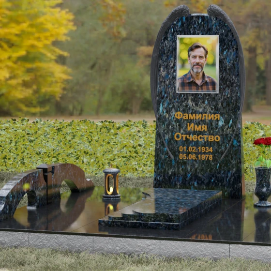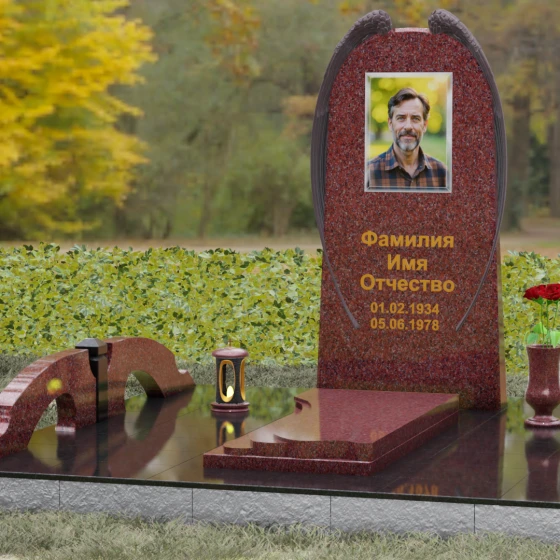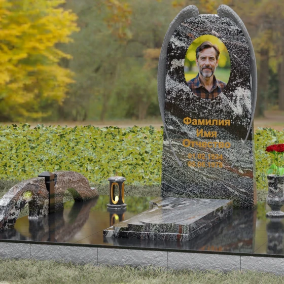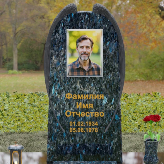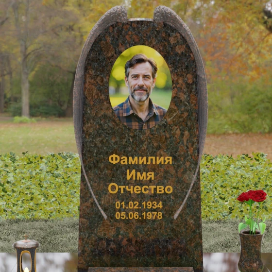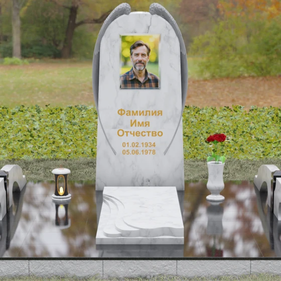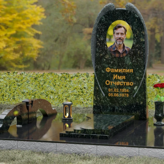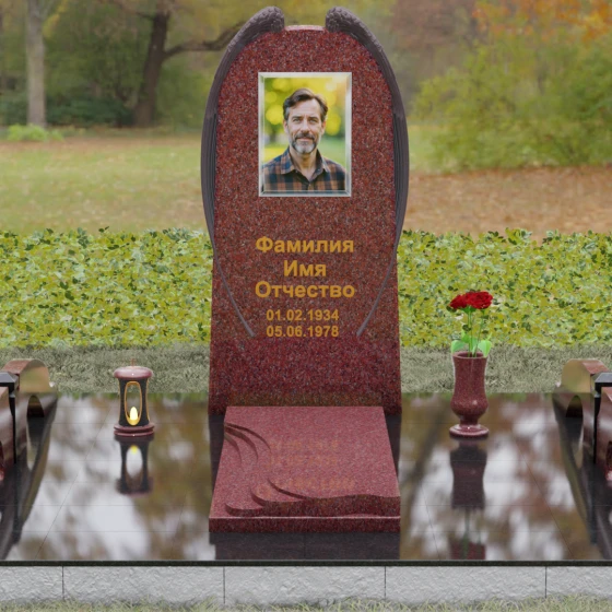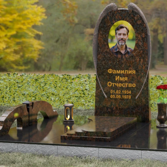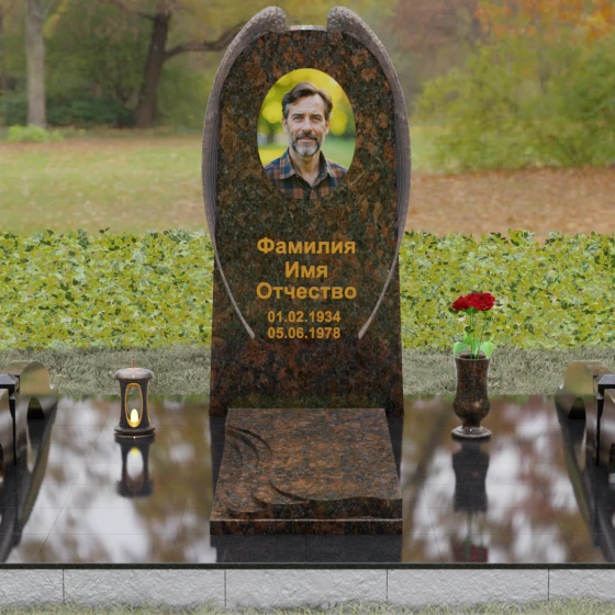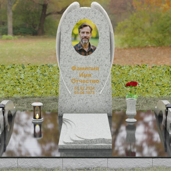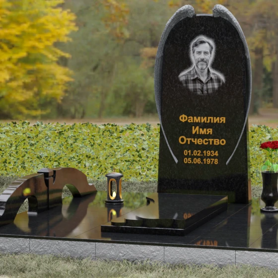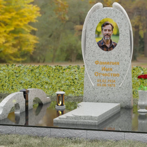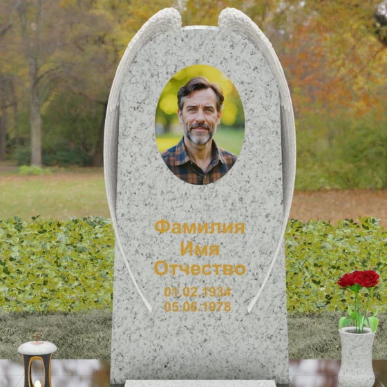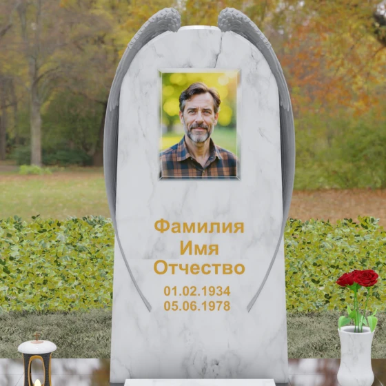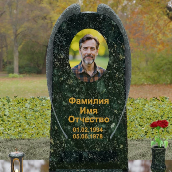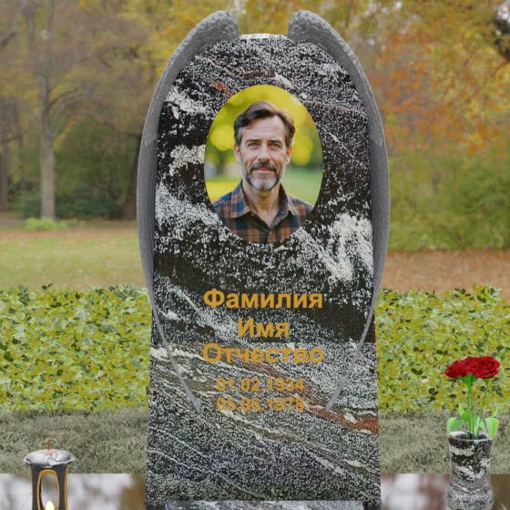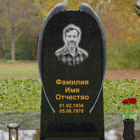 На широкой лицевой панели предусмотрено идеальное место для расположения портрета. Форма стелы позволяет гармонично вписать как классическую гравировку, так и цветной керамический медальон в овальной нише. Золоченая вырубка букв, как показано в образце, идеально сочетается с фактурной резьбой крыльев, делая надписи читаемыми и эстетически безупречными. Мы поможем вам подобрать именно то сочетание камня и декора, которое станет достойным отражением души того, кто вам дорог.