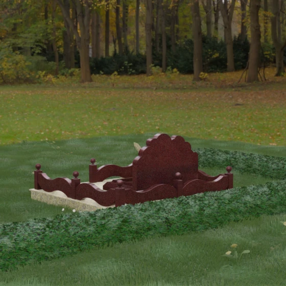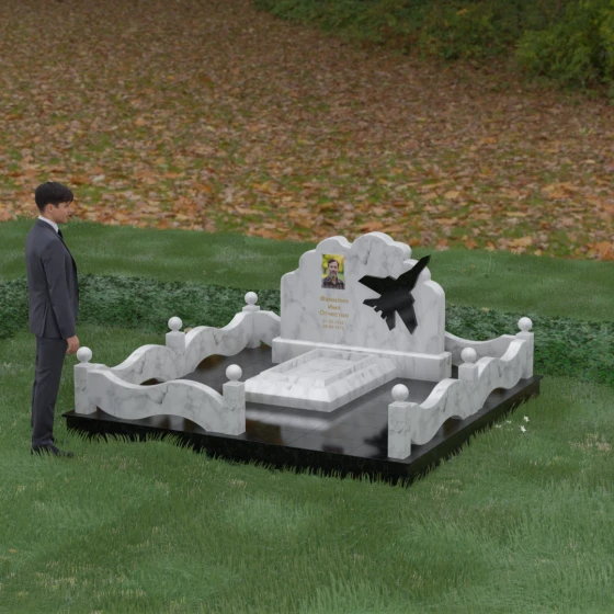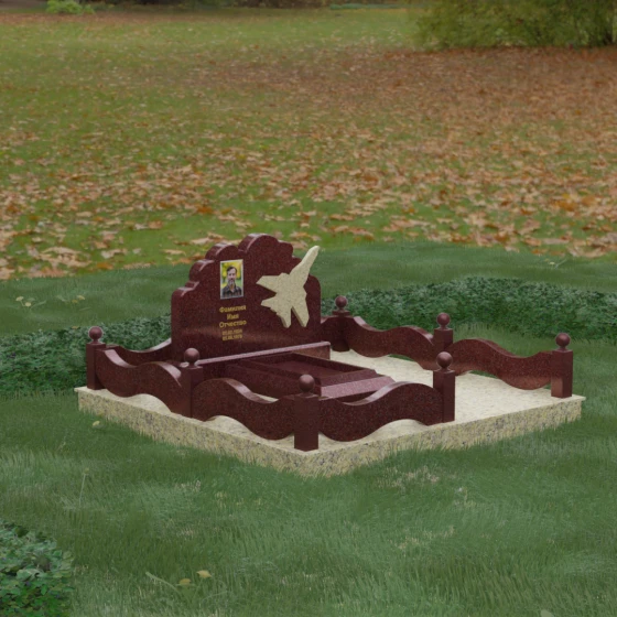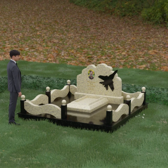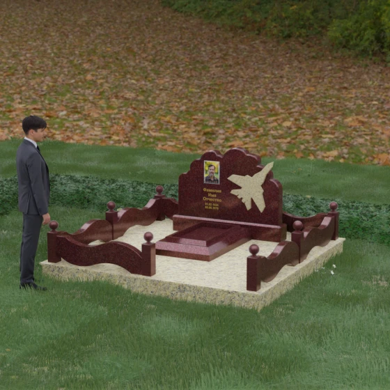 Данная мемориальная композиция представляет собой величественный ансамбль, в котором строгость камня смягчается плавностью природных линий. Выбор горизонтальной формы стелы продиктован стремлением создать ощущение покоя, стабильности и масштабности. Главным акцентом изваяния служит искусно выполненный силуэт истребителя, который словно устремляется ввысь на фоне резного навершия, напоминающего кучевые облака. Эта деталь превращает надгробие в персональный трибьют человеку, чья жизнь была неразрывно связана с небом, высотой и долгом перед Отечеством. Плавная волна верхнего края стелы гармонично перекликается с формой ограждения, создавая единое визуальное пространство, наполненное глубоким смыслом и уважением к памяти ушедшего.