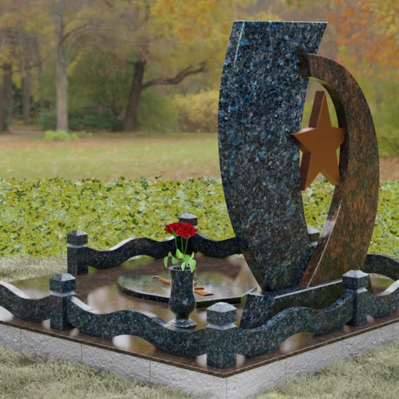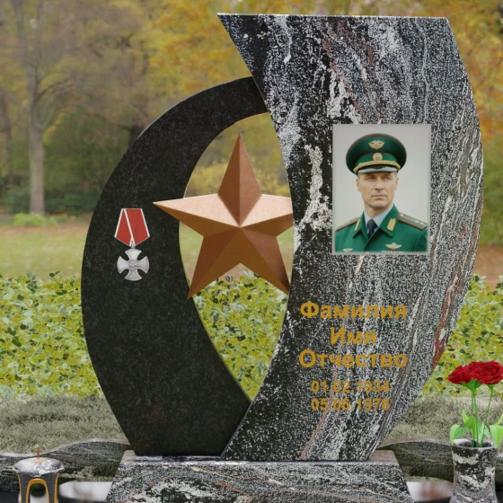 Композиция мемориала построена на динамичном контрасте двух асимметричных стел, которые словно стремятся навстречу друг другу, образуя защитную арку вокруг центрального символа. Левая часть выполнена из насыщенного, текстурированного гранита с выраженным природным рисунком, что олицетворяет сложность и многогранность человеческой судьбы. На этой части расположена детально проработанная резьба в виде медали — знака доблести и чести. Правая часть стелы, имеющая более строгую и вытянутую форму, предназначена для размещения портрета и памятных надписей. Её зеркально отполированная поверхность создает глубокий черный фон, на котором золотая гравировка выглядит особенно благородно.