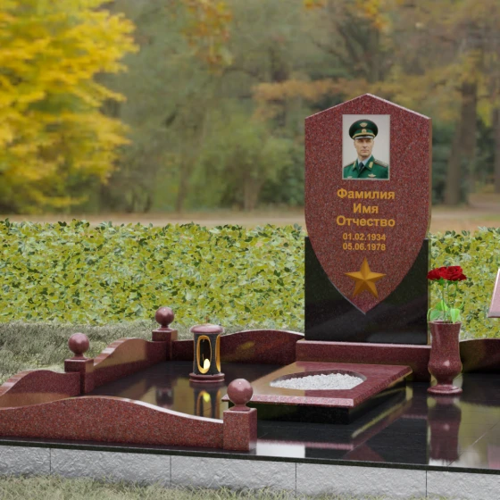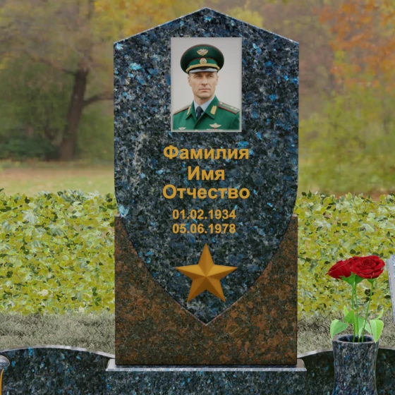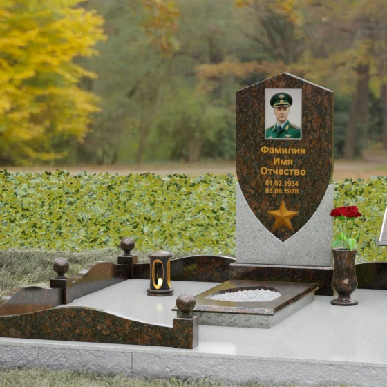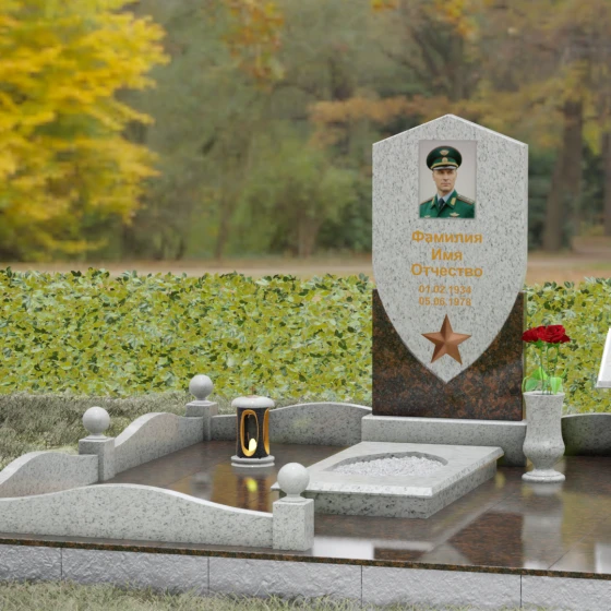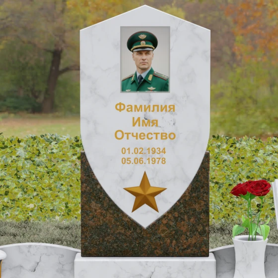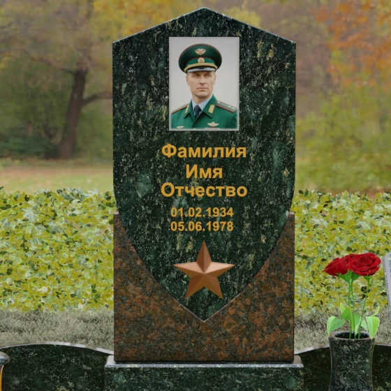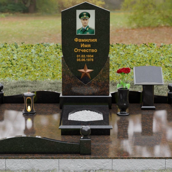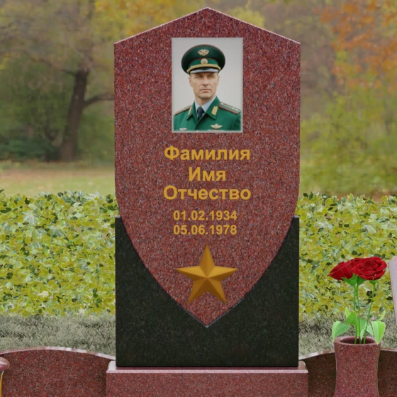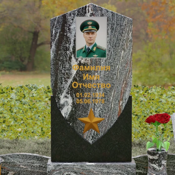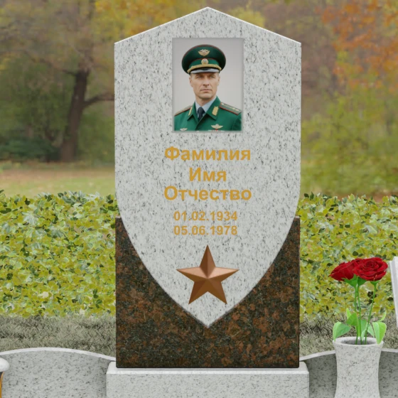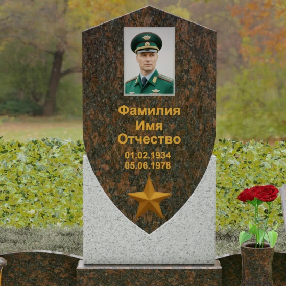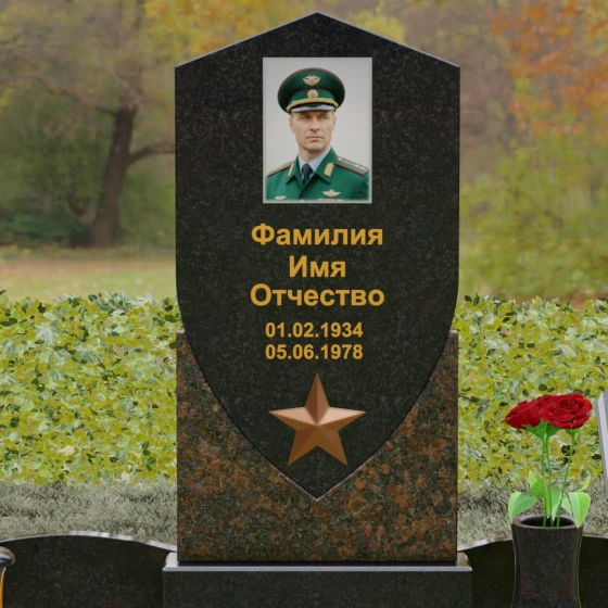 Форма щита в мемориальной архитектуре традиционно олицетворяет защиту, честь и непоколебимую волю. Это надгробие из натурального камня словно оберегает покой усопшего, напоминая о его мужестве и твердости духа. Выбор именно такой формы подчеркивает, что человек при жизни был опорой для своей семьи и преданно служил своему делу. Звезда и строгие формы акцентируют внимание на дисциплине и преданности идеалам.