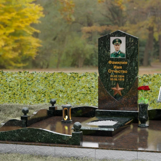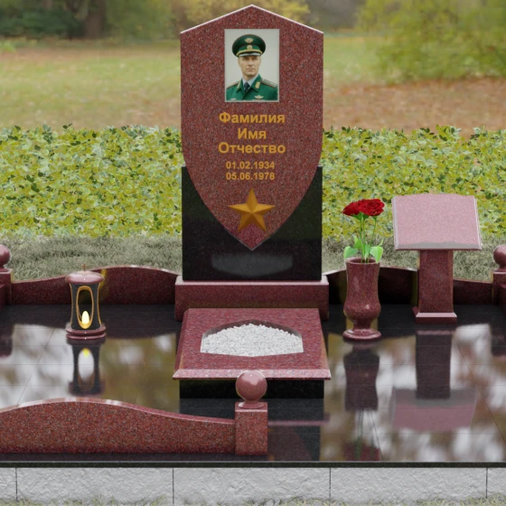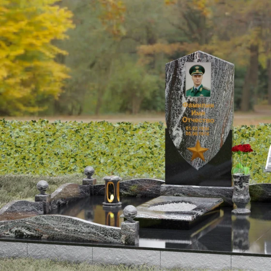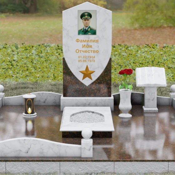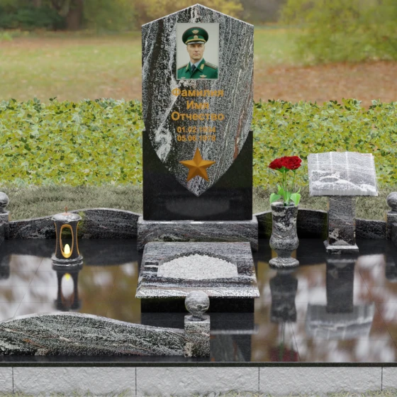Особое внимание уделено деталям оформления: в нижней части «щита» расположен объемный бронзовый барельеф в виде пятиконечной звезды, символизирующей доблесть и служение отечеству. Благоустройство участка выполнено на высочайшем уровне: по периметру установлен низкий каменный цоколь, углы которого украшены массивными полированными столбиками с навершиями в виде идеальных шаров. Справа от основной стелы располагается дополнительный элемент — мемориальная плита в форме раскрытой книги на постаменте, предназначенная для нанесения эпитафий или памятных слов, что придает комплексу завершенный и гармоничный вид.