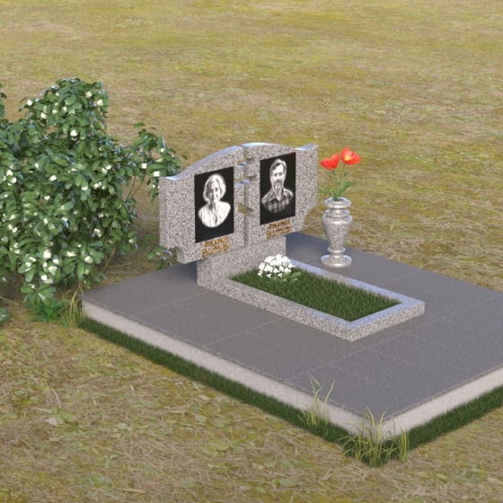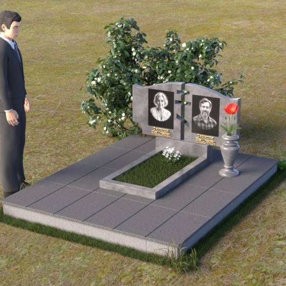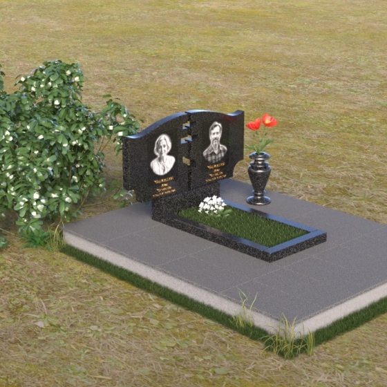 Величественная стела памятника ПГ016 представляет собой композицию из двух вертикальных элементов, объединенных общей идеей и стилем. Каждый элемент имеет свою индивидуальную форму, но вместе они создают гармоничный и целостный образ. Стела выполнена из полированного гранита глубокого черного цвета, который служит идеальным фоном для гравировки портретов и надписей. Контраст между гладкой, зеркальной поверхностью и выгравированными изображениями создает эффект глубины и выразительности. Между двумя стелами прорезана фигура креста, символизирующая веру и духовность. Этот элемент добавляет композиции особое значение и подчеркивает ее сакральный характер. Справа от портрета выгравирована изящная роза, ее лепестки искусно проработаны, создавая ощущение объема и реалистичности. Цветы символизируют любовь, память и скорбь об ушедшем.