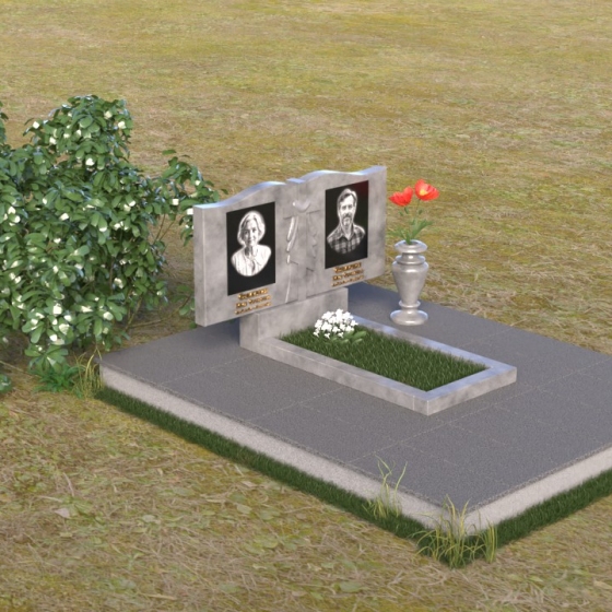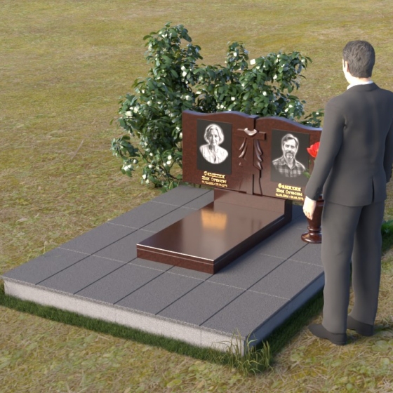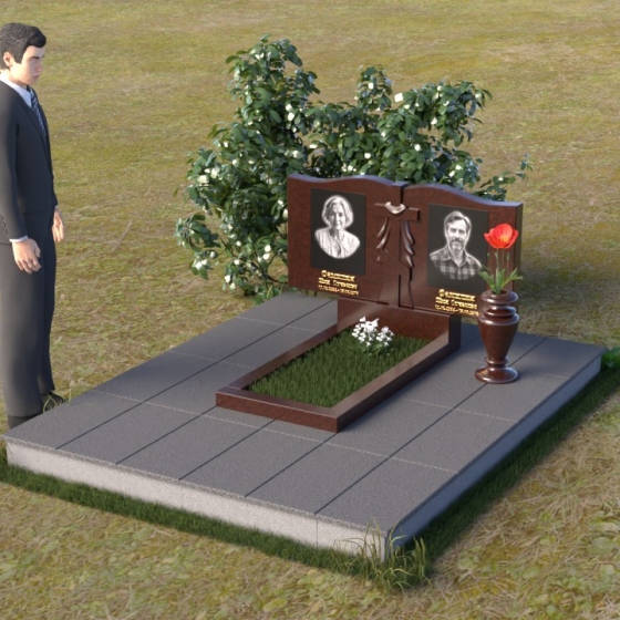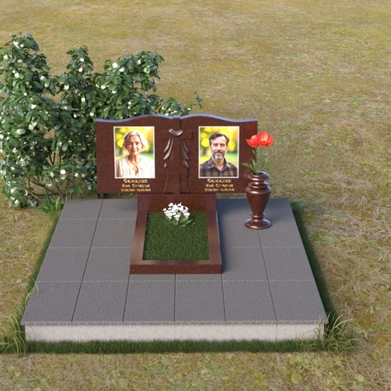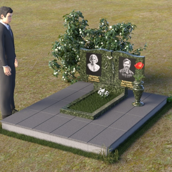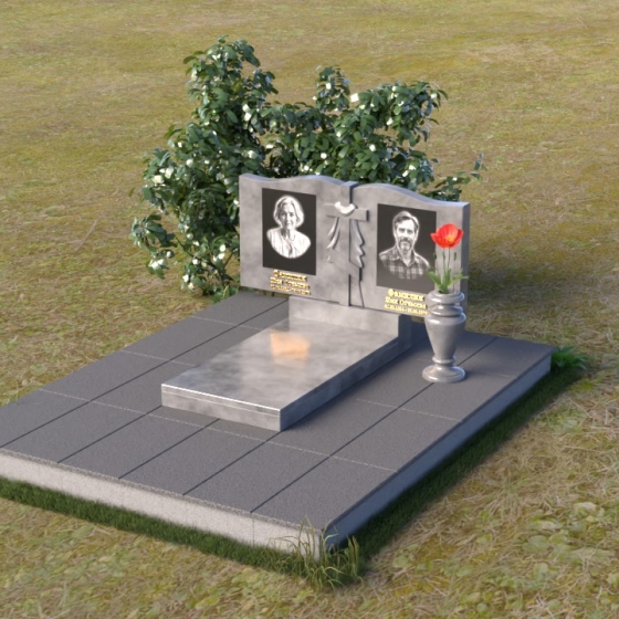 Данная мемориальная композиция представляет собой две стелы, выполненные из полированного гранита глубокого черного цвета, соединенные между собой. Каждая стела имеет мягкую, волнообразную форму верхней части, словно склоненную в тихой скорби. Боковые грани плавно скруглены, что придает изделию мягкость и элегантность. На лицевой поверхности стел выгравированы портреты, имена и даты, выполненные с высокой детализацией. Разделяет стелы искусно вырезанный крест, лаконичный и строгий, устремленный ввысь. Его грани контрастируют с полированной поверхностью, создавая игру света и тени, придающую рельефу дополнительный объем. Под стелами располагается горизонтальная плита, также выполненная из черного гранита, с зеркальной полировкой, отражающей небо и окружающий мир, символизируя вечность и непрерывность жизни. Дополняет композицию изящная ваза из гранита, предназначенная для живых цветов, которые станут символом любви и памяти.