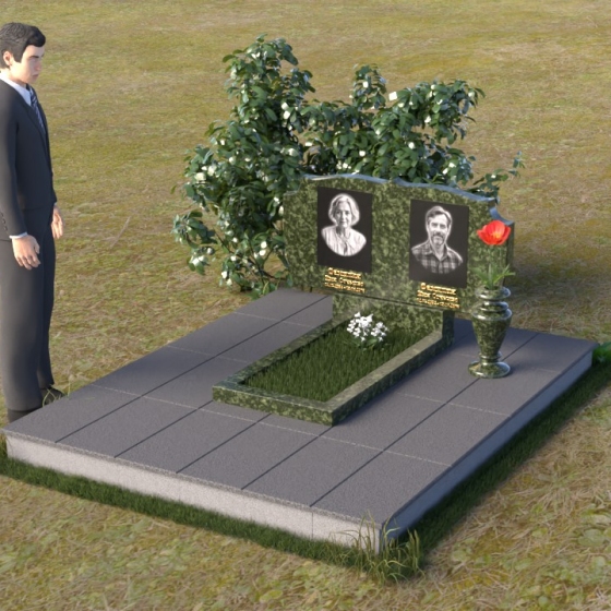 Композиция монумента строится на контрасте плавных линий и строгих геометрических форм. Верхняя часть, несущая на себе портреты усопших, имеет форму, напоминающую раскрытую книгу или свиток, где каждая страница хранит историю жизни. Края этого "свитка" искусно обработаны: верхняя грань словно оплавлена временем, приобретая мягкие, неровные очертания, а боковые стороны имеют более четкий, но все же сглаженный профиль. Фаска, идущая по периметру, придает верхней части визуальную легкость, отделяя ее от основания. Нижняя часть представляет собой прямоугольную плиту с зеркальной полировкой, отражающей небо и окружающий мир, создавая эффект бесконечности и связи с ушедшим. Она словно портал, соединяющий мир живых и мир мертвых, напоминая о непрерывности бытия. Боковины плиты имеют четкую геометрию, подчеркивая основательность и незыблемость памяти.