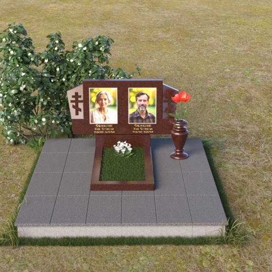 Оформление: Для этой формы надгробия идеально подойдет гравировка портретов в строгом, классическом стиле. Четкие линии и реалистичность изображения позволят сохранить в памяти облик усопших. Имена, отчества и даты жизни, выполненные элегантным шрифтом, дополнят композицию и придадут ей завершенный вид. Рекомендуется использовать шрифт с засечками, чтобы подчеркнуть торжественность момента.