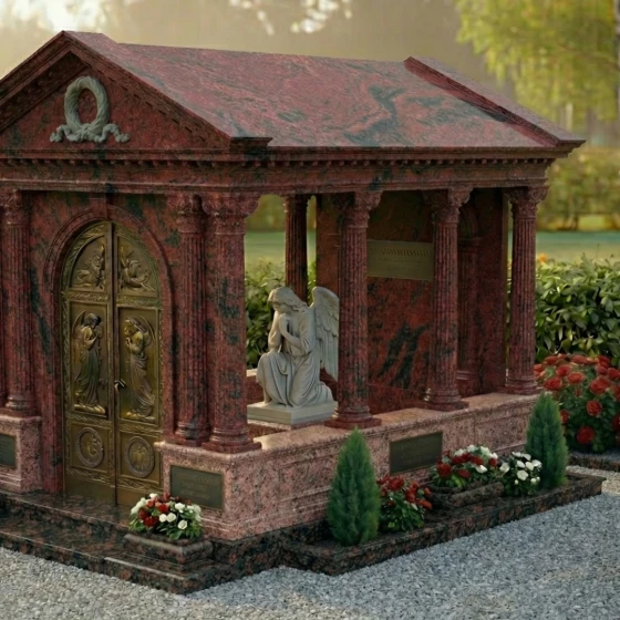 Основой этого уникального мемориального комплекса является прочный и долговечный гранит, известный своей исключительной плотностью, устойчивостью к любым погодным условиям и способностью сохранять свой первозданный вид на протяжении веков. Зеркальная полировка поверхности камня не только придает ему благородный блеск, но и защищает от воздействия влаги и мороза, делая уход за памятником минимальным. Монумент установлен на массивный гранитный цоколь, который опоясывает весь периметр, придавая конструкции дополнительную устойчивость и законченный вид. Высокий бордюр, выполненный из того же камня, что и основание, создает четкие границы и подчеркивает монументальность комплекса. Внутреннее пространство комплекса выложено аккуратными надгробными плитами, что не только создает эстетически завершенный вид, но и значительно упрощает уход за местом упокоения. Эти плиты, выполненные в едином стиле с основным материалом, гармонично вписываются в общую композицию. По углам комплекса расположены декоративные элементы – невысокие каменные столбики, которые подчеркивают архитектурный стиль и придают мавзолею еще большую торжественность. Вазы, расположенные вдоль цоколя, идеально подходят для размещения живых цветов, добавляя нотку тепла и жизни в эту величественную композицию.