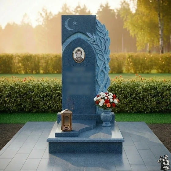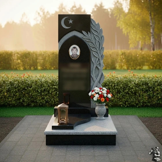 Центральная стела, выполненная в форме вертикального прямоугольника с выразительными асимметричными элементами, сразу привлекает внимание. Ее левая грань обработана с идеальной полировкой, создавая зеркальную поверхность, в которой отражается окружающий мир, символизируя бесконечность бытия. В верхней части стелы расположен изящный полумесяц со звездой, вырезанный с особой тщательностью, что придает памятнику глубокий религиозный смысл и подчеркивает индивидуальность усопшего. Ниже этого символа, в углублении, напоминающем стрельчатую арку, помещена овальная фотокерамика с портретом, обрамленная тонким рельефным кантом, что придает изображению особую значимость и защищенность.