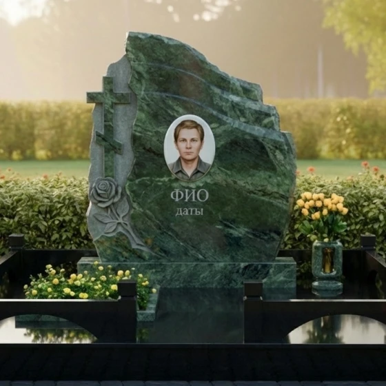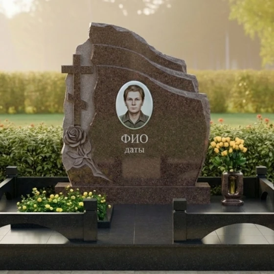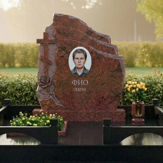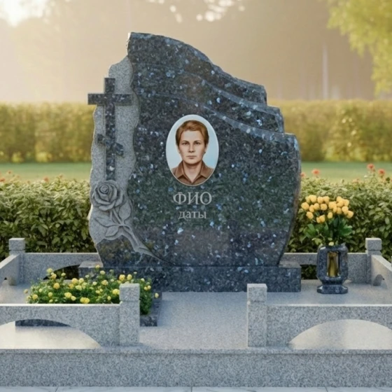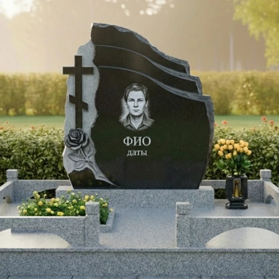 Оформление: Учитывая асимметричную форму стелы, портрет рекомендуется размещать по центральной оси или с небольшим смещением вправо, чтобы уравновесить резную розу и крест. Для ФИО и дат идеально подойдет академический шрифт с глубокой гравировкой и покрытием «под золото» или «под серебро», что добавит монументу аристократизма и читаемости на темном фоне камня.