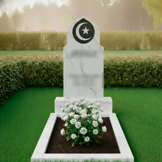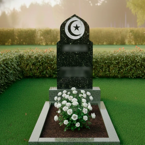 Данный мемориальный ансамбль представляет собой истинное воплощение благородства и духовной глубины. Величественная стела, выполненная в форме традиционного восточного купола или стрельчатой арки, сразу приковывает взгляд своей безупречной геометрией. Главным художественным акцентом композиции является искусно интегрированный медальон из белоснежного мрамора, расположенный в верхней части обелиска. В центре этого светлого круга филигранно вырезаны символы веры — полумесяц и пятиконечная звезда. Контраст между глубоким темным цветом основного камня и матовой чистотой мраморной вставки создает эффект небесного свечения, подчеркивая торжественность и значимость момента памяти. Плавные, но при этом строгие линии резьбы по контуру стелы свидетельствуют о высочайшем уровне камнерезного мастерства, превращая холодный камень в одухотворенное изваяние.