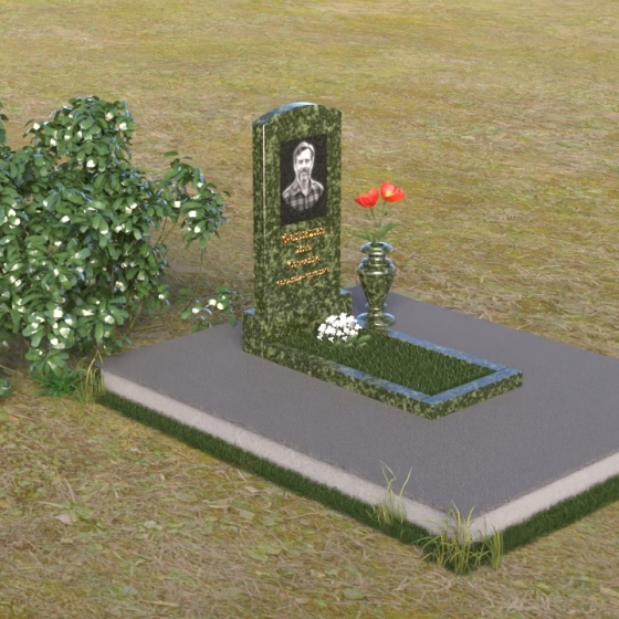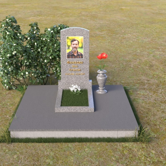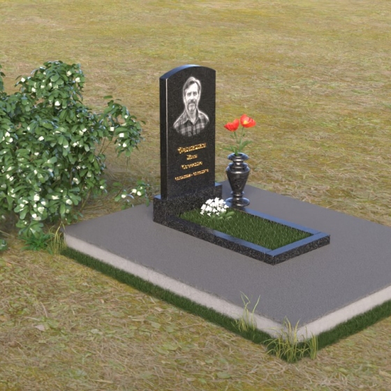 Благодаря своей лаконичной форме, эта стела предоставляет широкие возможности для оформления. Портрет усопшего будет гармонично смотреться как в верхней части стелы, так и чуть ниже центра. Золотое тиснение имени и дат жизни будет элегантно выделяться на фоне полированного камня, создавая четкий и легко читаемый образ. Небольшая тумба, расположенная перед стелой, может служить местом для возложения цветов и памятных вещей. Мы рекомендуем выбирать для этой модели сдержанные, лаконичные шрифты, которые подчеркнут общую элегантность композиции. Подумайте о возможности добавления небольшого бронзового барельефа или скульптуры, отражающей профессию или увлечения ушедшего человека. Это добавит индивидуальности и сделает место памяти еще более личным и значимым. Ваза, выполненная в едином стиле с монументом, завершит композицию и придаст ей законченный вид.