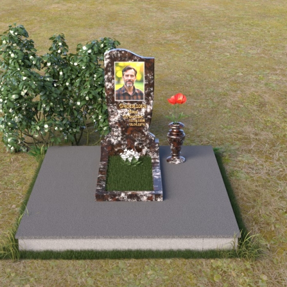 Величественная стела памятника ПВ 015 выполнена в строгой, но элегантной форме. Верхняя часть памятника имеет плавный, волнообразный силуэт, что придает ему мягкость и изящество. Сглаженные углы и отсутствие острых граней создают ощущение покоя и умиротворения. Боковые грани стелы слегка скошены, что визуально облегчает конструкцию и добавляет ей динамичности. Фаска, обрамляющая верхнюю часть памятника, подчеркивает его контур и придает завершенность образу. Нижняя часть стелы, переходящая в тумбу, имеет строгую прямоугольную форму, обеспечивая устойчивость и надежность всей конструкции. Зеркальная полировка поверхности камня отражает окружающий мир, создавая ощущение глубины и света. На стеле располагается портрет усопшего, выполненный с высокой точностью и детализацией, а также памятная надпись, нанесенная золотыми буквами.