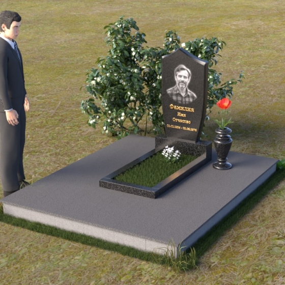 Особое внимание привлекает подставка под стелу, выполненная в том же стиле и материале. Она служит надежным основанием и визуально объединяет композицию. Рядом располагается прямоугольная надгробная плита с идеально отполированной поверхностью, способной выдержать любые погодные условия, сохраняя свой первозданный блеск на долгие годы. На этой гладкой поверхности можно разместить эпитафию, слова любви и скорби, которые будут вечно напоминать о дорогом человеке. Контраст между черным глянцем полировки и светло-серым цветом основания создает гармоничный и сдержанный образ, полный достоинства и уважения.