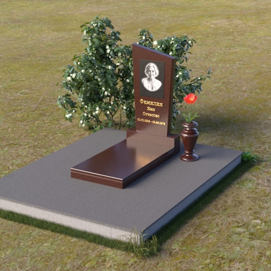 Мемориальная композиция состоит из нескольких элементов, каждый из которых тщательно продуман и выполнен с безупречным качеством. Начинается все с основания – широкой, массивной плиты, которая обеспечивает устойчивость всей конструкции. Её матовая, слегка шероховатая поверхность призвана оттенять блеск полированных элементов, создавая игру фактур и контрастов. Далее взгляд переходит к горизонтальной стеле, расположенной на постаменте. Она выполнена в виде прямоугольника с плавными, скругленными углами, что придает ей мягкость и элегантность. Поверхность стелы отполирована до зеркального блеска, отражая небо и окружающий мир, словно напоминая о связи между земным и небесным. На постаменте возвышается вертикальная стела с портретом и надписью. Верхняя часть стелы имеет скошенный угол, что добавляет динамики и оригинальности всей композиции. На стеле выгравированы имя, фамилия и отчество усопшего, а также даты жизни, выполненные изящным шрифтом. В правом углу композиции расположена ваза, предназначенная для цветов. Её классическая форма и полированная поверхность гармонично дополняют общий стиль мемориала.