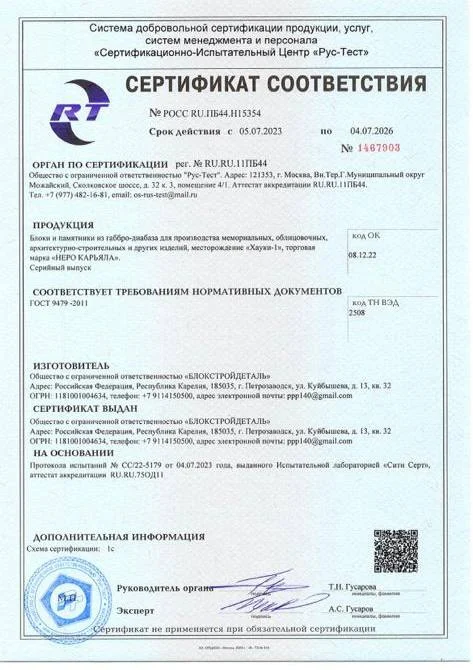 Мы хотим, чтобы вы были абсолютно уверены в качестве и безопасности материала, из которого будет изготовлен памятник для ваших близких. Поэтому мы публикуем сертификаты соответствия на основные виды гранита, которые мы используем в работе.
