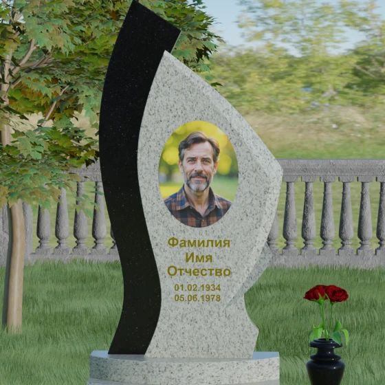 Форма этого памятника глубоко символична. Асимметрия олицетворяет жизненный путь — не всегда ровный, но всегда уникальный. Сочетание двух разных пород камня в одной стеле символизирует неразрывную связь души и тела, земного и вечного. Плавный изгиб верхней кромки напоминает защитное крыло или тихую волну памяти, уносящую печаль, оставляя лишь светлые воспоминания. Этот монумент внушает чувство покоя и защиты, словно оберегая покой ушедшего своей массивной и надежной конструкцией.