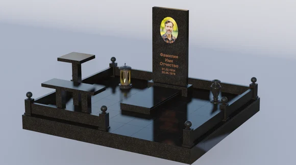 Конструкцию поддерживают два декоративных столба, которые служат архитектурными акцентами всего комплекса. По всей высоте колонн вырезана сложная орнаментальная вязь. Этот традиционный узор придает мемориалу индивидуальность, подчеркивая статус и благородство исполнения. Нижняя часть комплекса — это массивный многоуровневый цоколь, который служит надежным фундаментом. Продуманное благоустройство участка включает в себя полное мощение плитами в единой цветовой гамме с основным сооружением. Это не только придает объекту монументальный и законченный вид, но и значительно упрощает уход за местом захоронения, избавляя от необходимости борьбы с сорной травой.